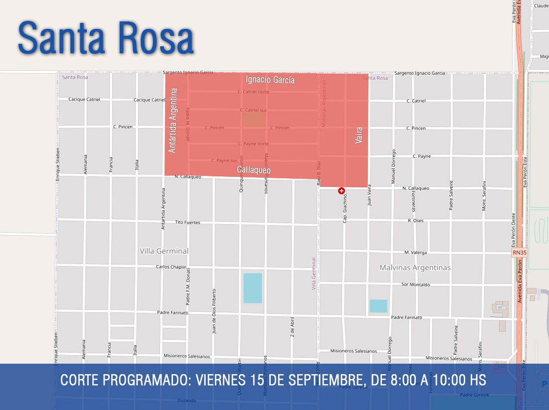 La CPE informó que este viernes 15 de septiembre habrá un corte programado de energía eléctrica, desde las 8:00 a las 10:00 horas, en la zona delimitada por calles Ignacio García, Vaira, Callaqueo y Antártida Argentina.
