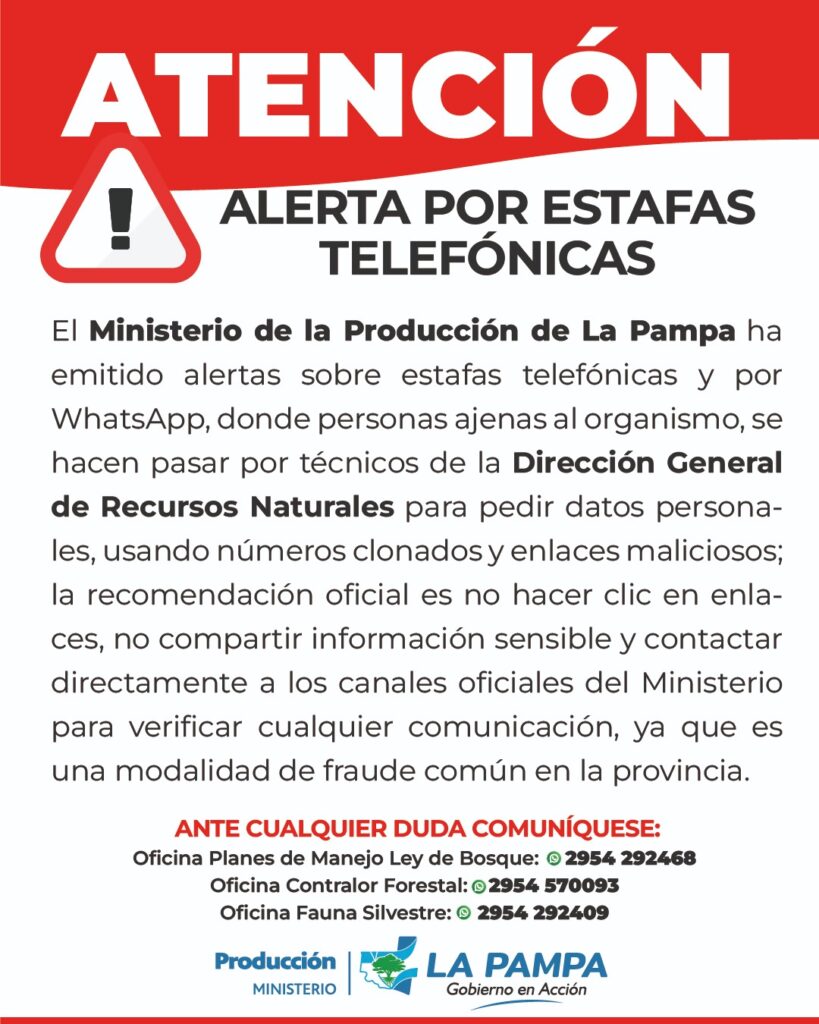 Se detectaron intentos de estafas telefónicas y a través de WhatsApp en los que personas ajenas al organismo se hacen pasar por supuestos técnicos de la Dirección General de Recursos Naturales.