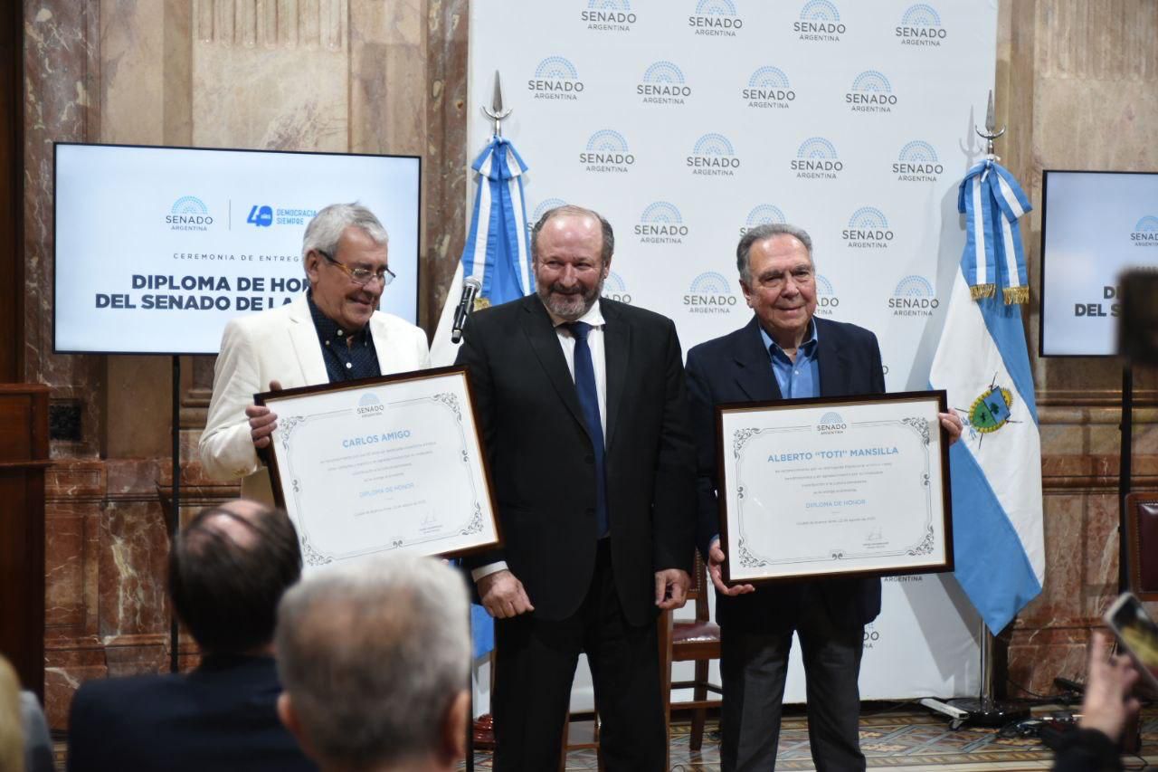 Los músicos pampeanos Carlos Amigo y Alberto “Toti” Mansilla recibieron de manos del senador nacional Daniel Kroneberger, los Diplomas de Honor por sus trayectorias y sus aportes a la cultura de la provincia.
