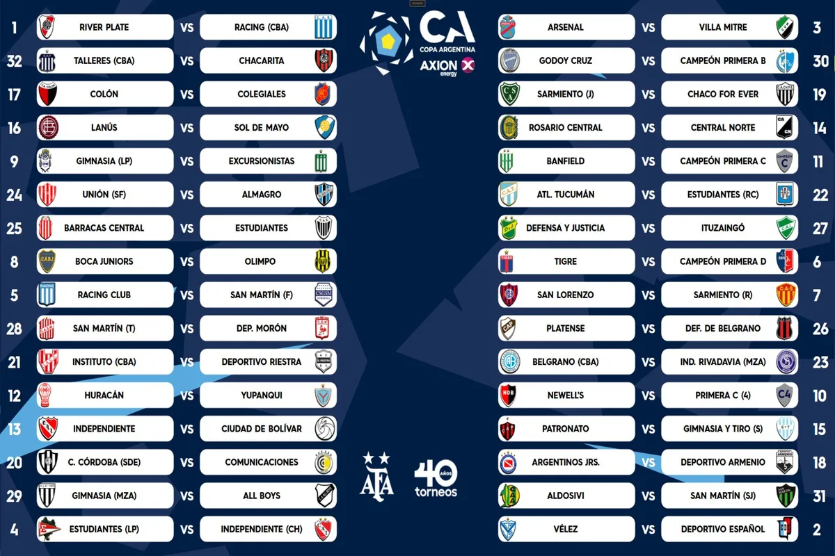 Además, otros cruces serán Vélez-Deportivo Español, Arsenal-Villa Mitre, Estudiantes de La Plata-Independiente de Chivilcoy, Tigre contra el campeón de la D, Gimnasia y Esgrima La Plata-Excursionistas, Newell´s ante el ganador de la Primera C, Rosario Central-Central Norte y Lanús-Sol de Mayo.