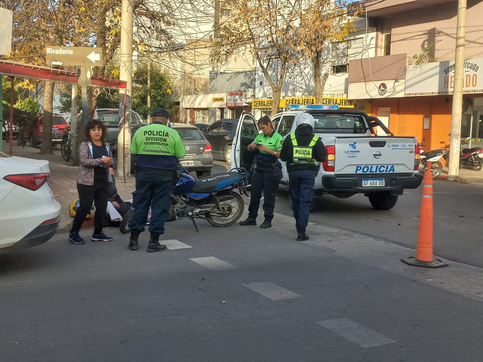 En la esquina de Rivadavia y L. De la Torre en el centro de Santa Rosa, impactaron un Fiat Cronos conducido por una mujer que circulaba por L. De la Torres y una moto Honda quie era conducida por otra mujer, que circulaba por Rivadavia.