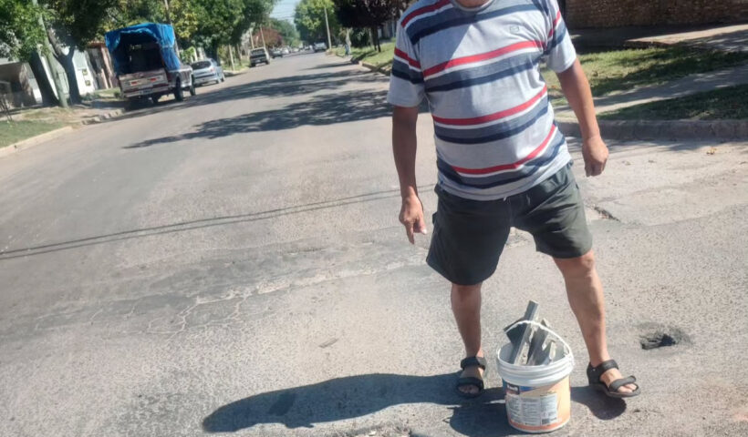 El vecino Miguel Díaz, se encargó por cuenta propia de tapar los pozos que se encontraban en la esquina de su vivienda de Pio XII…