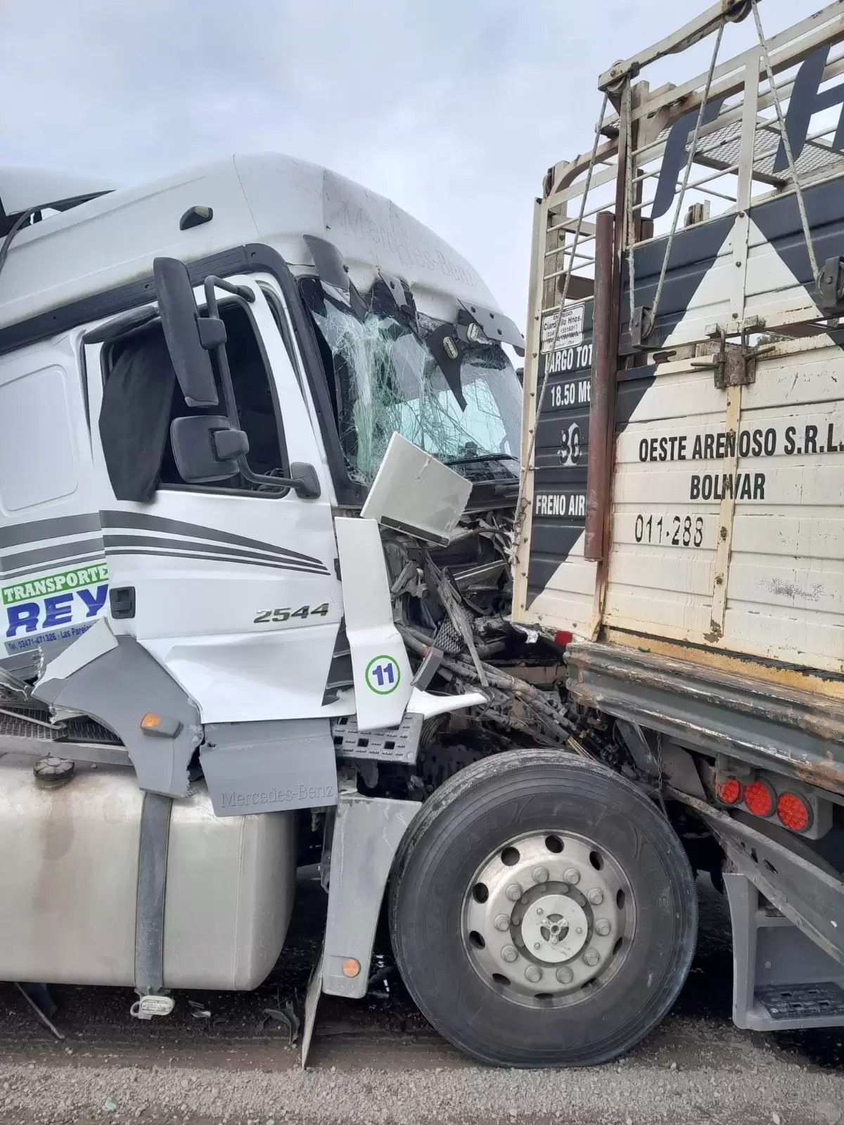 Minutos antes de las 11:30 Hs. se produjo una colisión entre dos camiones, uno de ellos un camión Mercedes Benz semiremolque dominio AF604MZ conducido por Julio Cesar Álvarez (39), quien circulaba por RN 5 sentido Cs. Cs. – Pehuajó .por causas que se trata de establecer es colisionado en su parte trasera por camión Mercedes Benz dominio AE156OI conducido por Herrera Carlos (51), quien circulaba mismo sentido.