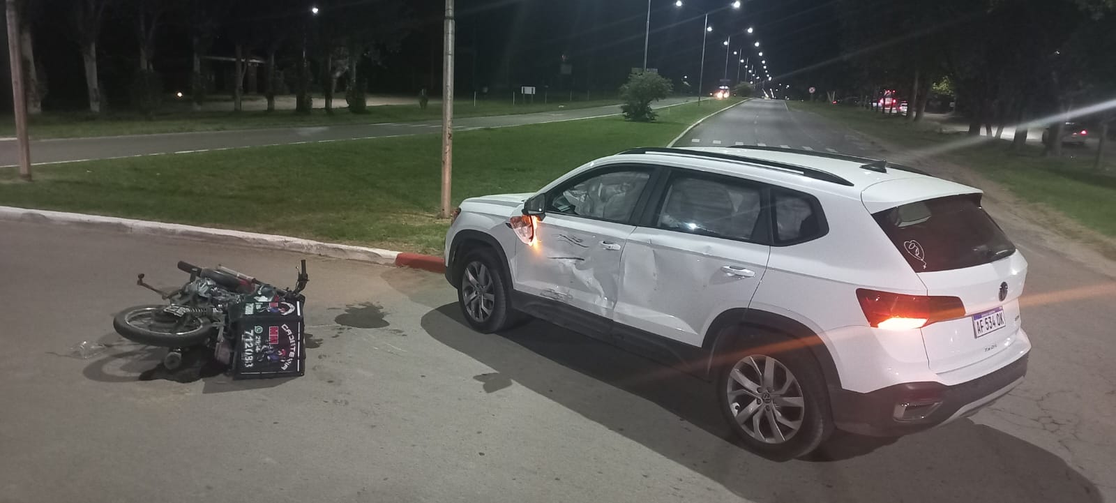 Sucedió este viernes a las 20 horas, en la Avenida Perón. Un cadete que circulaba en moto, impactó a una SUV Taos VW en su lateral izquierdo.