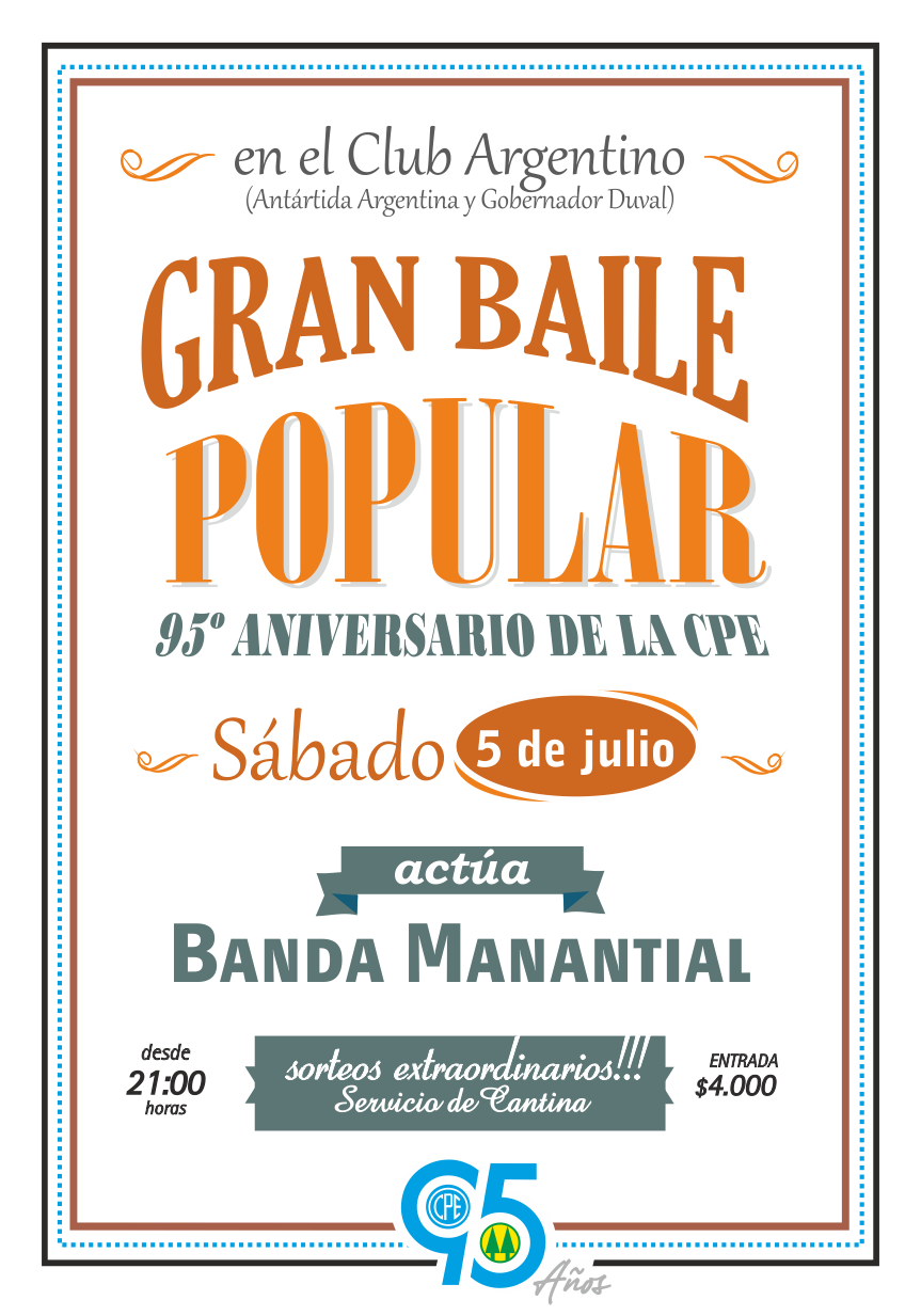 La CPE invita a la comunidad a una nueva edición de sus tradicionales bailes populares, que en esta ocasión se realizará el próximo sábado 5 de julio, desde las 21 horas, en el salón del Club Argentino (ubicado en Antártida Argentina y Gobernador Duval).