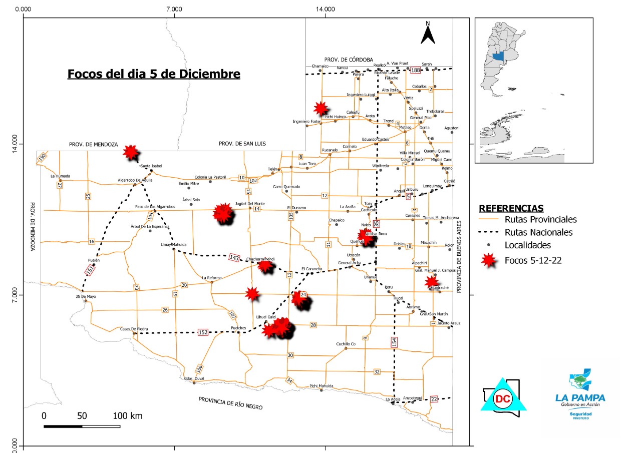 Por otra parte, los restantes 8 siniestros están en situación de contenidos, debido a la continuidad de fuertes vientos y altas temperaturas. Los mismos se registraron en las zonas de Chalileo, sobre la Ruta provincial N° 14 a 25 kilómetros al oeste de Jagüel del Monte; en Lihuel Calel, a 34 kilómetros al suroeste del cruce de las Rutas nacionales N° 143 y 152; en Utracán, aproximadamente a 9 kilómetros al sureste de la localidad de Chacharramedi; en Curacó, en cercanía a las Rutas provinciales N° 24 y 15; en Utracán, a 13 kilómetros al noreste de la localidad de Quehué y 12 al oeste de Ataliva Roca; y Rancul, sobre la Ruta provincial N°11 a 18 kilómetros al norte de La Maruja.