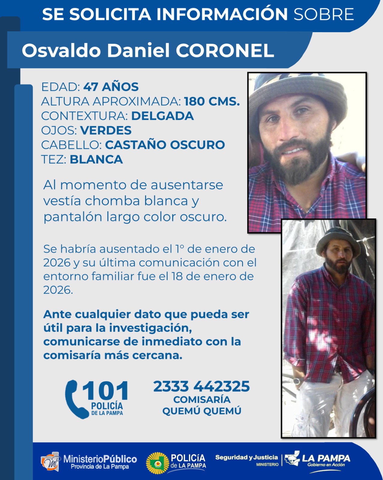 María Pía Collazo , fiscal adjunta de la Unidad de Atención Primaria de la II Circunscripción del Ministerio Público Fiscal con asiento en la ciudad de General Pico, confirmó que se encuentra en trámite una averiguación de paradero para dar con Osvaldo Daniel Coronel, de 47 años, oriundo de Quemú Quemú.