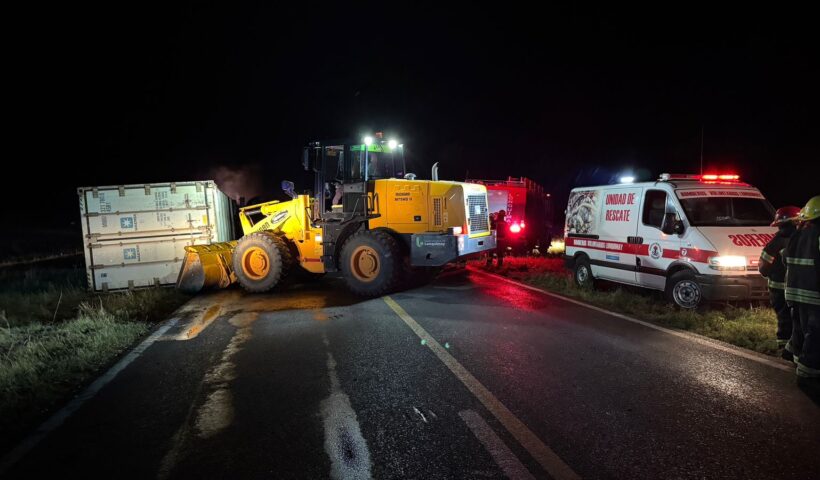Un camión Scania con acoplado perteneciente a la empresa bonaerense Impocort SA, que transporta carne de exportación, volcó y se prendió fuego en la ruta…