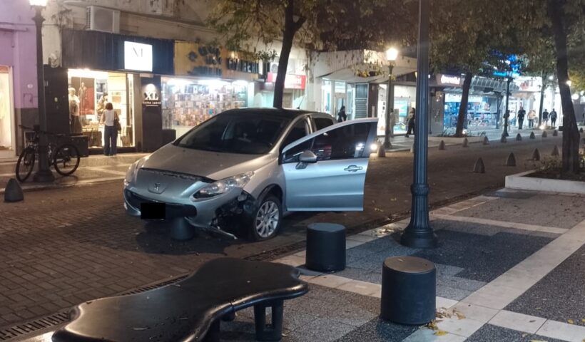 Otro automóvil «colgado» de un bolardo en la Semi-Peatonal de Santa Rosa. Serios daños en el frente del vehículo. En esta oportunidad, un Peugeot 308…
