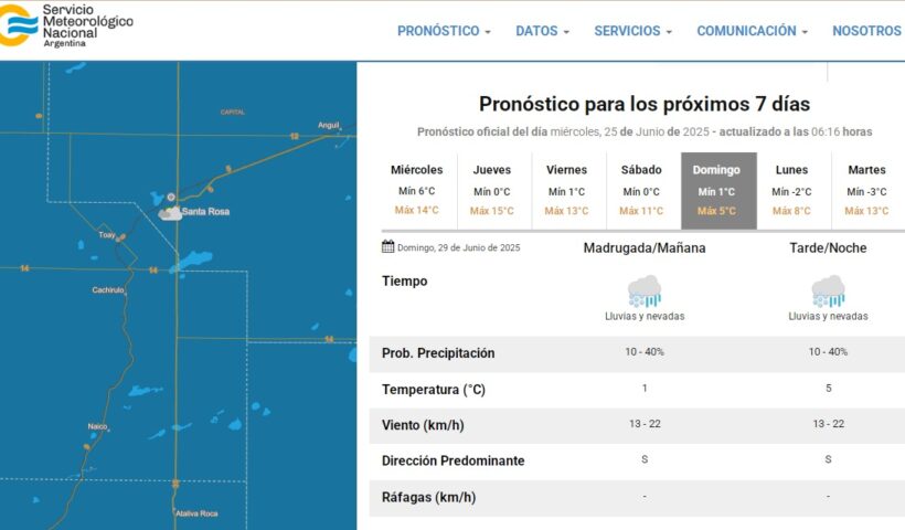El pronóstico extendido del Servicio Meteorológico Nacional informó que este domingo la temperatura máxima será de 5 ° y la mínima alcanzará apenas 1° para…