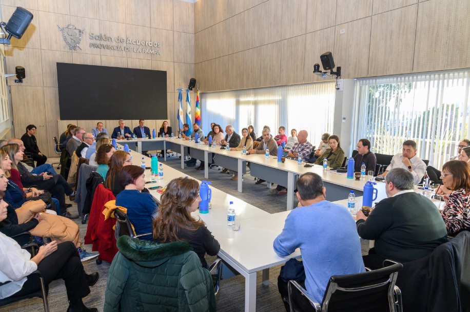 El gobernador Sergio Ziliotto, junto al ministro de Gobierno y Asuntos Municipales, Pascual Fernández; al titular de la cartera de Trabajo y Promoción del Empleo, Marcelo Pedehontaá y la Asesora Letrada de Gobierno, Griselda Ostertag, se reunió con representantes de más de veinte entidades profesionales de La Pampa.