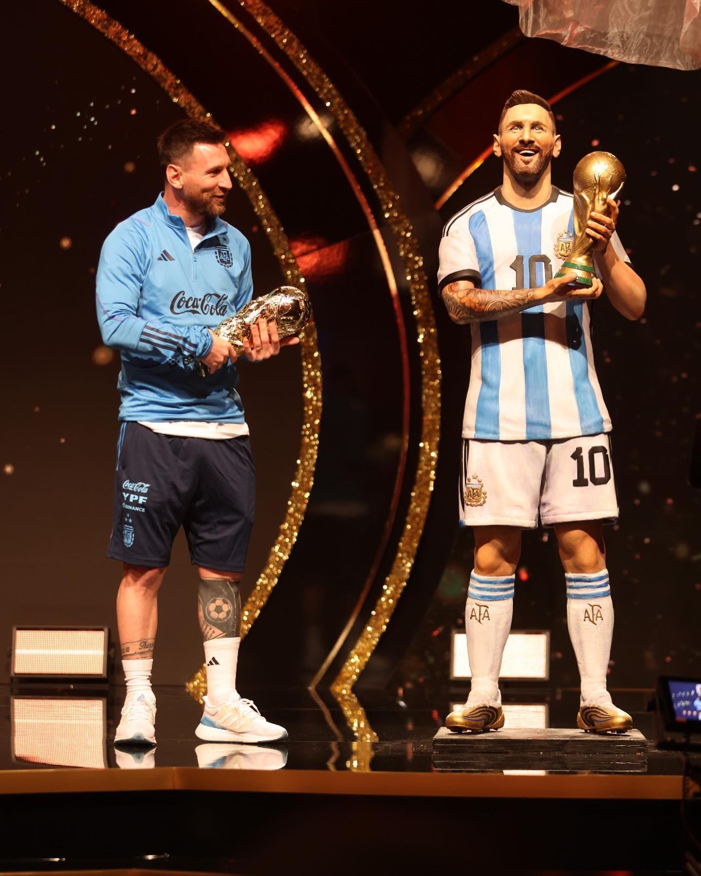 Continuando con el reconocimiento al rosarino, se recreó un diálogo entre Pelé y Maradona con inteligencia artificial. Después, Alejandro Domínguez volvió a subir al estrado junto al jugador del París Saint Germain al cual le entregó la réplica de las tres copas que obtuvo la “Scaloneta” y le comentó, entre risas: “La que te falta es la Libertadores”.