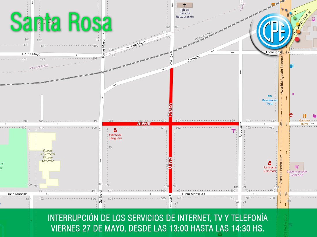 El área de Telecomunicaciones de la CPE informó que este viernes 27, desde las 13:00 hasta las 14.30 horas, habrá un corte de los servicios de internet, televisión por cable y telefonía, en unas pocas cuadras de la zona céntrica de Santa Rosa, para realizar tareas de mantenimiento en la red.