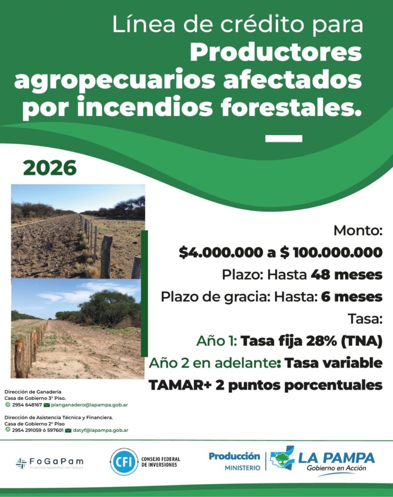 El Gobierno de La Pampa, a través del Ministerio de la Producción, informa la puesta en marcha de una línea de financiamiento que va desde los 4.000.000 hasta los 100.000.000 de pesos. Está destinada a productores agropecuarios que hayan sido afectados por incendios forestales en el territorio provincial.