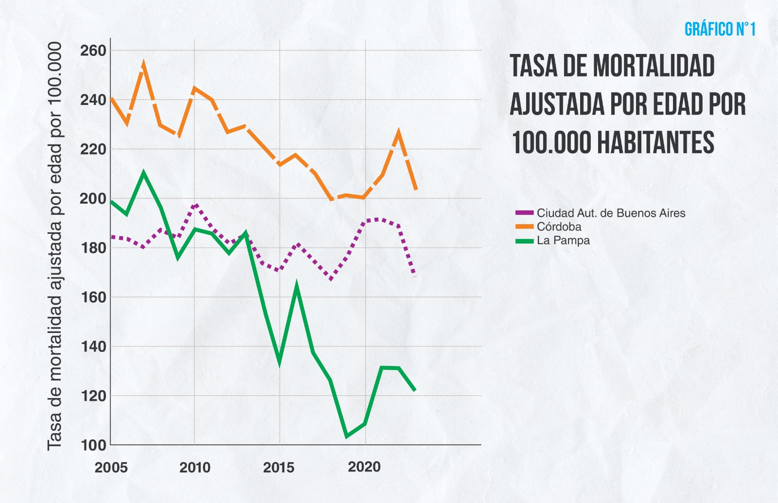 Según datos oficiales del Ministerio de Salud de la Nación, La Pampa logró reducir la mortalidad por enfermedades del sistema circulatorio de 198,2 por cada 100.000 habitantes en 2005 a 103 en 2019, una baja del 48% que supera ampliamente los avances registrados en jurisdicciones como CABA (184 a 176 un descenso del 4%) y Córdoba (240 a 200 una disminución del 17 %). (Gráfico 1)