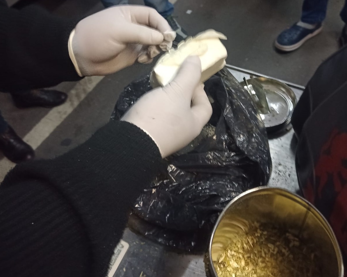 Fue así como se descubrió que el hombre ocultaba en un recipiente cilíndrico y metálico un trozo compacto de 317 gramos de cocaína, además de yerba mate. Asimismo, se le encontró una balanza de precisión y una importante suma de dinero en efectivo, que ascendía a 20.000 pesos y 700 dólares estadounidenses.