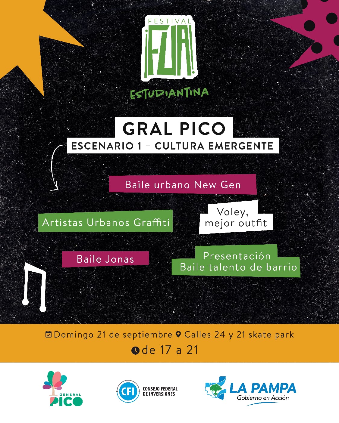 Este domingo 21, en General Pico, se desarrollará la tercera edición del Festival Itinerante FUA, el evento que lleva el arte y la cultura a todos los rincones de La Pampa. En el marco de esta iniciativa del Gobierno de La Pampa, que se propone recorrer toda la Provincia, de este a oeste y de norte a sur, los artistas piquenses y de las zonas aledañas tendrán la oportunidad de desplegar su talento en el escenario. El evento es organizado por el Gobierno provincial, juntamente con la Municipalidad de General Pico, y cuenta con financiamiento del Consejo Federal de Inversiones (CFI). En sus dos ediciones anteriores, realizadas en Toay y General Acha, los espectáculos tuvieron enorme repercusión y movilizaron al público de las ciudades sedes y sus zonas de influencia. Esta vez, al tratarse del día de la llegada de la primavera y, al mismo tiempo, celebración del día del Estudiante, el Festival tendrá características especiales. Los organizadores decidieron armar dos espectáculos en simultáneo y a uno de ellos lo denominaron “Estudiantina”, para estar a tono con el espíritu que reinará en el Skate Park ubicado en calles 24 y 21.