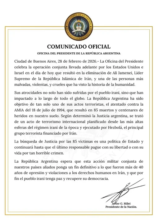 El comunicado firmado por el presidente Javier Milei dejó en claro la postura que tiene la Argentina frente al ataque realizado por Estados e Israel y celebró la “eliminación” de Alí Jamenei. Este hecho logró ponerle fin a las atrosidades que no solamente sufrió el pueblo iraní, sino que sus actos fueron padecidos por “el resto del globo”.