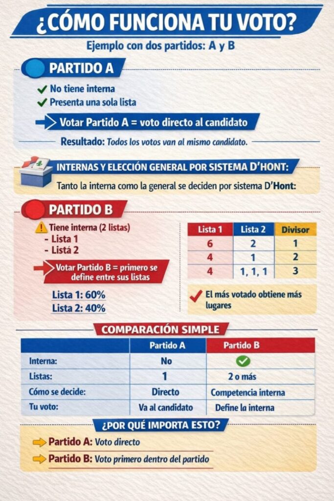 - Cada elector recibe una única boleta con todas las opciones. Puede seleccionar un partido o alianza. En caso de existir internas, puede elegir una lista específica o no hacerlo. Si no elige lista interna, su voto igualmente cuenta para la elección general.