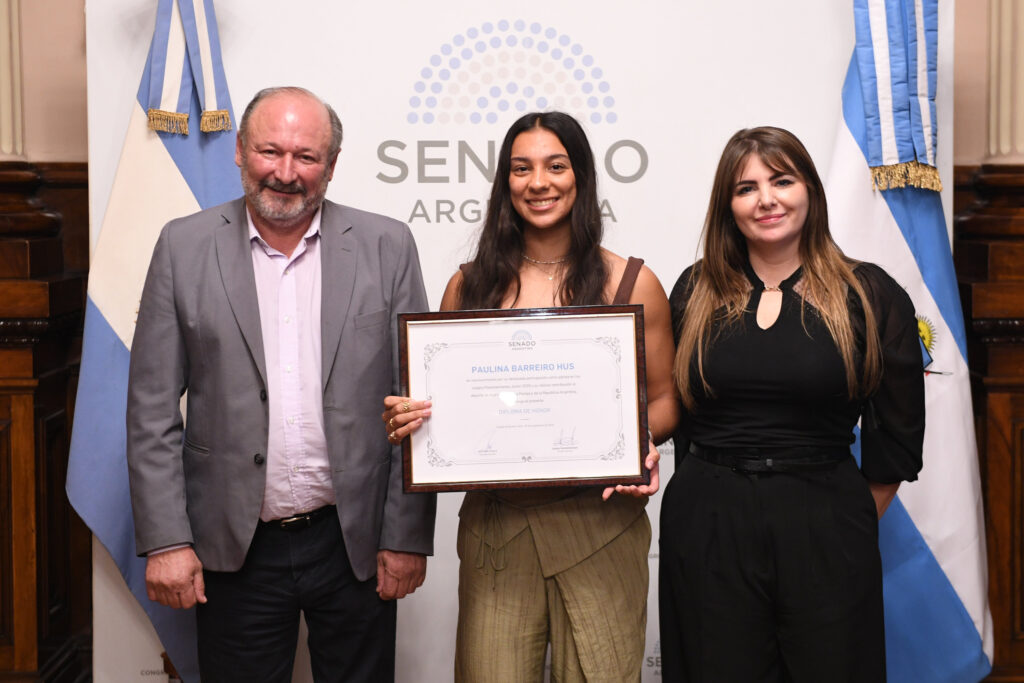 En un emotivo acto celebrado en el Salón Eva Perón del Congreso de la Nación, los senadores pampeanos Victoria Huala y Daniel Kroneberger entregaron el Diploma de Honor del Honorable Senado de la Nación a Paulina Barreiro Hus, joven deportista pampeana y triple campeona panamericana de canotaje junior.
