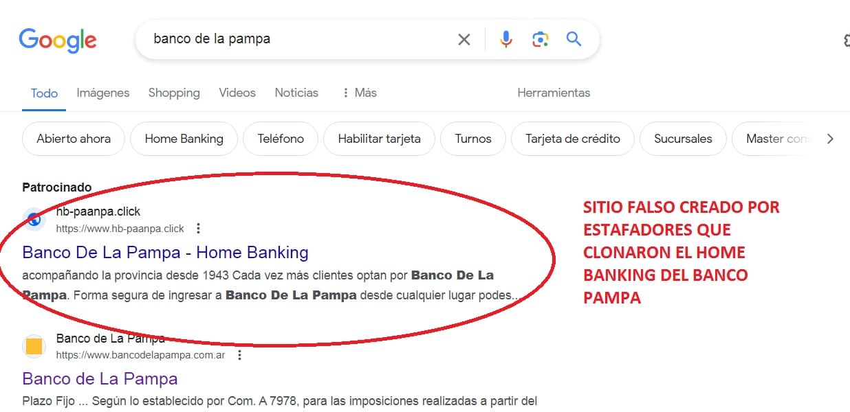 Los estafadores publicitan los sitios «clonados» y aparecen como primera opción cuando un usuario «Googlea» Banco Pampa en el popular buscador.