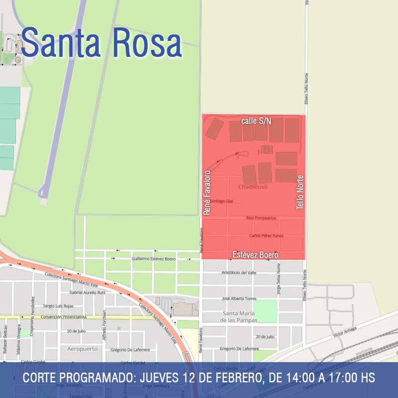 La CPE informa que este jueves 12 de febrero, desde las 14:00 hasta las 17:00 horas, se producirá un corte del suministro eléctrico en la zona comprendida por las calles René Favaloro, calle sin nombre, Eliseo Tello Norte y Estévez Boero, del barrio Chadileuvú de Santa Rosa. La interrupción del suministro incluirá al asentamiento Micaela García, la Escuela Agrotécnica, el predio del Club Estudiantes y zonas rurales aledañas.