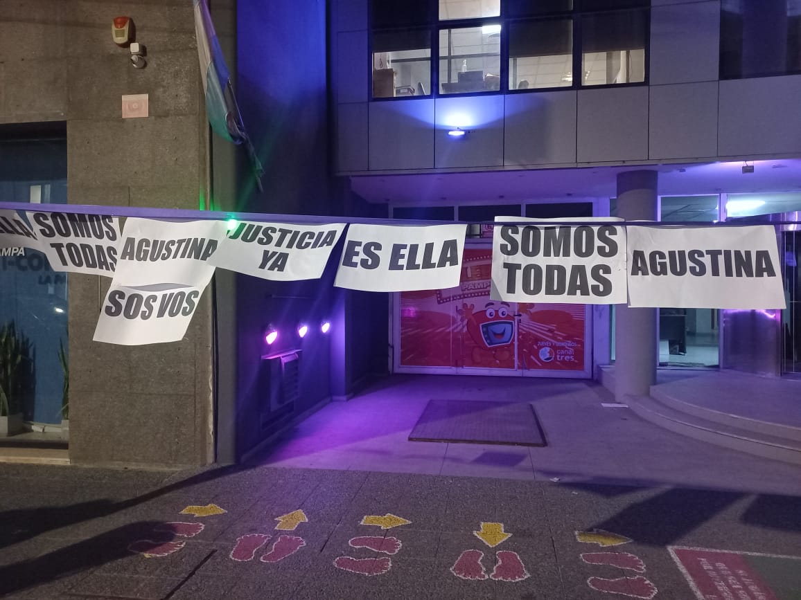 Este miércoles a un año del femicidio de Agustina Fernández, así amaneció el edificio de Dafas en Pellegrini 385 en Santa Rosa.