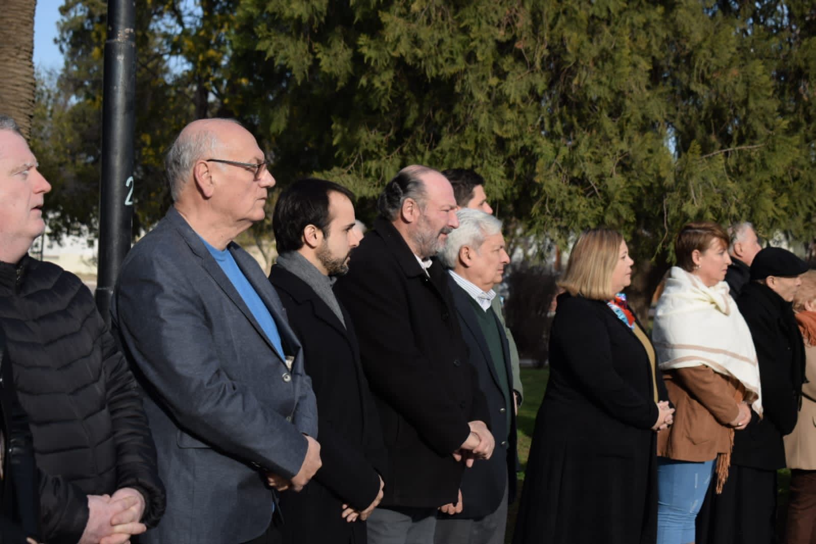 En la plaza central se llevó a cabo el acto donde se izó el pabellón nacional, se cantó el himno y se hizo entrega de placas a los comercios más antiguos de la localidad, finalizando con las palabras de Olivero.