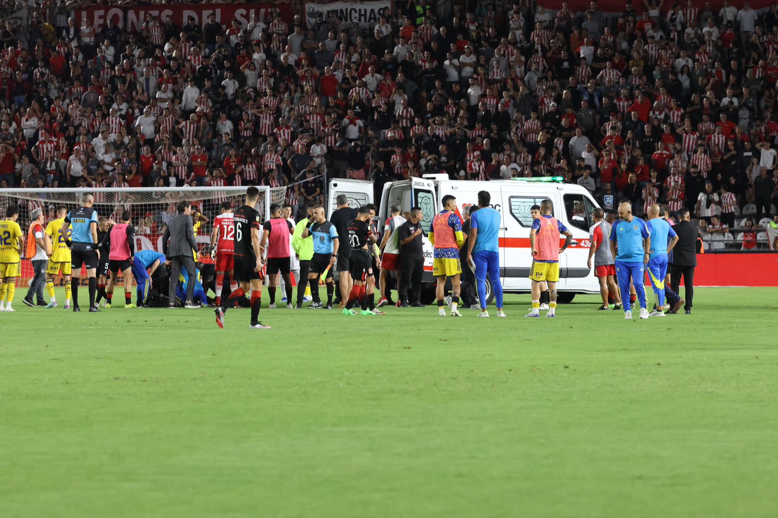 El mediocampista chileno cayó al suelo e inmediatamente todos pidieron ayuda instantánea. Ingresaron los médicos de ambos clubes y la ambulancia se lo llevó apenas ingresó.