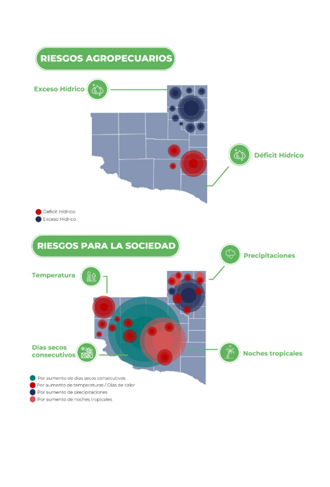 Riesgos Sociales y Económicos: Aumento de enfermedades asociadas al calor. Daños a infraestructuras y sistemas productivos, como la agricultura y la ganadería, claves para la economía provincial.