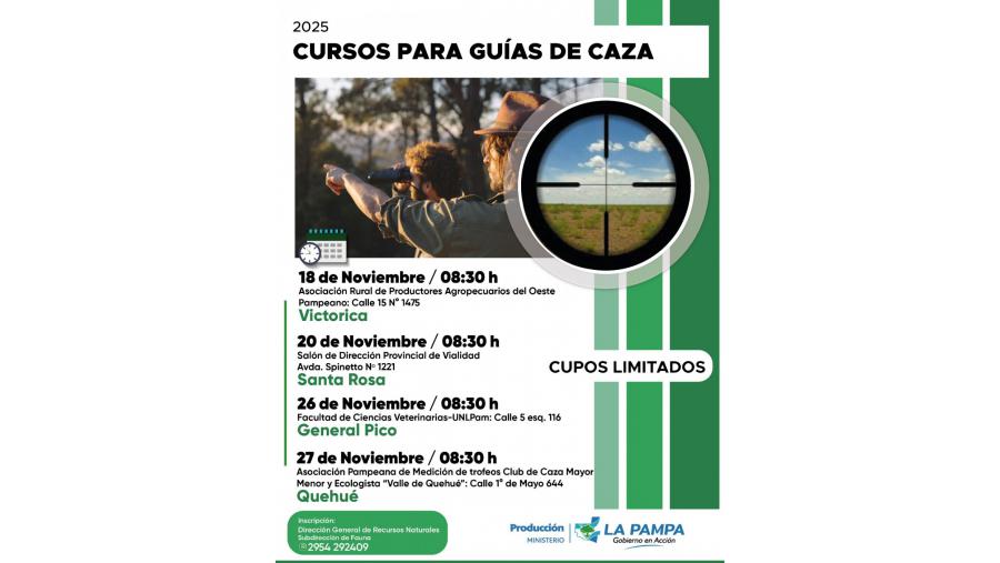 La Dirección General de Recursos Naturales del Ministerio de la Producción, comunico que durante el mes de noviembre del corriente año se dictarán Cursos de capacitación para “Guías de Caza” en distintas localidades y fechas. Los mismos darán inicio el 18 de noviembre en la localidad de Victorica; siguiendo el 20 de noviembre en la localidad de Santa Rosa; el 26 será en General Pico y por último el 27 de noviembre en la localidad de Quehué, todos a partir de las 8:30. Los interesados en participar y/o recibir más información deberán contactarse con la Dirección de Recursos Naturales al teléfono/whatsapp: 2954-292409; correo electrónico: faunarecursosnaturales@gmail.com; o en las siguientes Delegaciones: