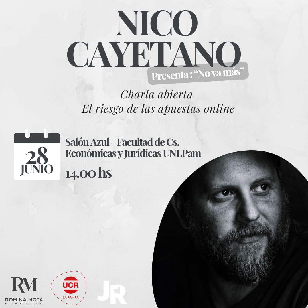 El día 28 de Junio, llega a Santa Rosa el periodista Nicolás Cayetano invitado por la Diputada Romina Mota para presentar su libro “No va más” y dialogar sobre “El riesgo de las apuestas online”. El evento será el próximo 28 de junio, a las 14 horas, en el Salón Azul de la Facultad de Ciencias Económicas y Jurídica de la UNLPam.