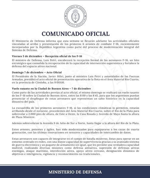 El arribo de la primera escuadrilla de cazas F-16 está programado para el viernes 5 de diciembre. El Ministro de Defensa recibirá a las aeronaves en Río Cuarto.