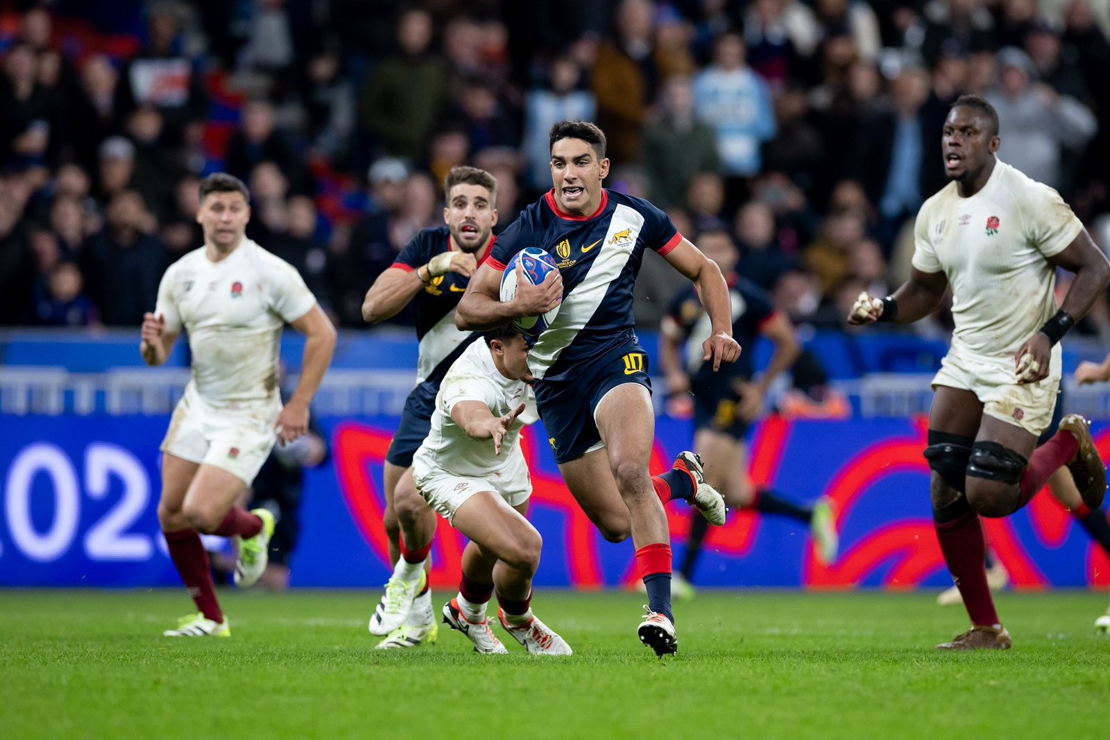 El inicio de la primera parte se le hizo muy cuesta arriba al conjunto albiceleste, realizó varias infracciones y tuvo errores defensivos y comenzó perdiendo 13-0 con dos penales de Owen Farrell y un try de Ben Earl. Pero con el correr de los minutos supo reaccionar y terminó el primer tiempo 16-10.