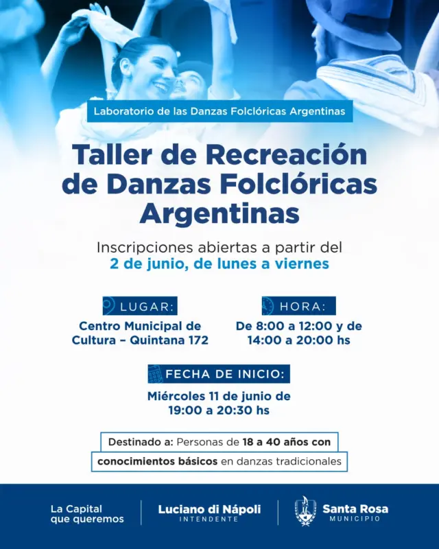 La Municipalidad de Santa Rosa invita a ser parte del “Laboratorio de Danzas Folclóricas Argentinas”, una propuesta de formación y exploración que incluye el Taller de Recreación de Danzas Folclóricas, destinada a personas de entre 18 y 40 años que cuenten con conocimientos básicos en el tema.
