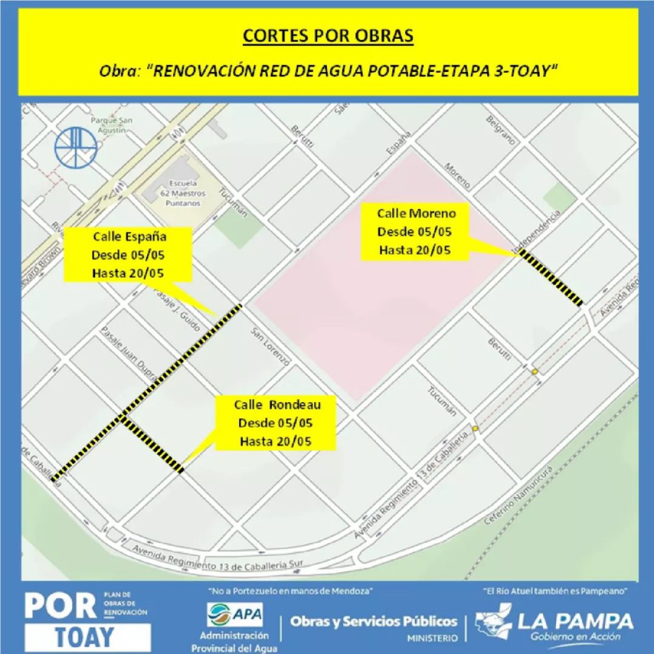 Desde el Ministerio de Obras y Servicios Públicos se informan los siguientes trabajos en la localidad de Toay. Los trabajos corresponden a la obra de Renovación Red de Agua Potable – Etapa III.