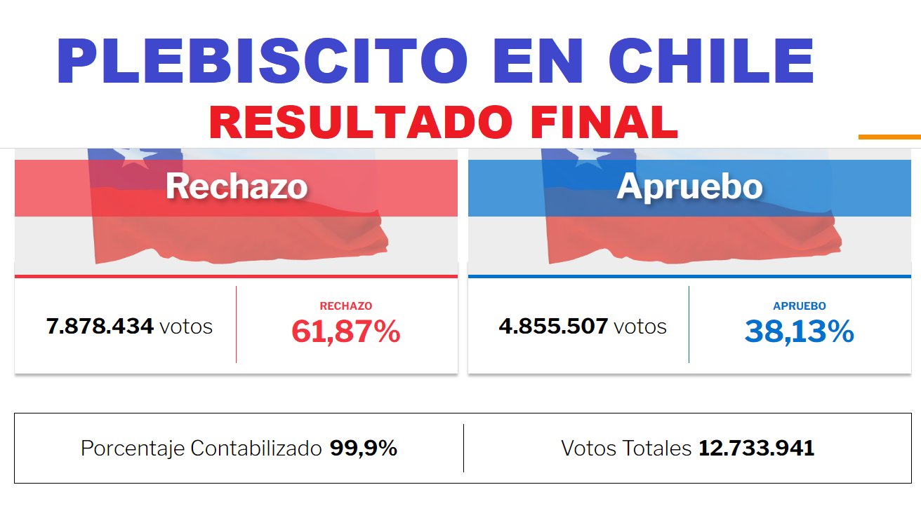 Los chilenos rechazaron ampliamente, en un plebiscito realizado este domingo, la propuesta de una nueva Constitución, según los primeros resultados reportados por la autoridad electoral.