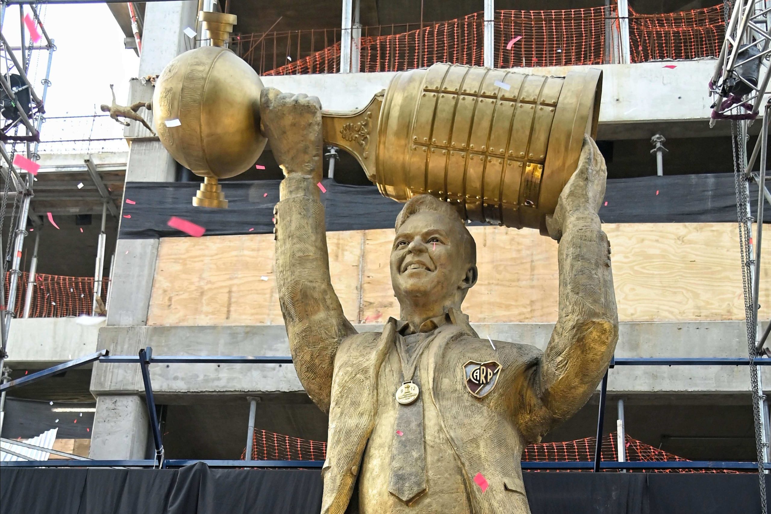 La estatua de bronce mide siete metros y pesa seis toneladas y media. Fue inaugurada ante una multitud de hinchas.
