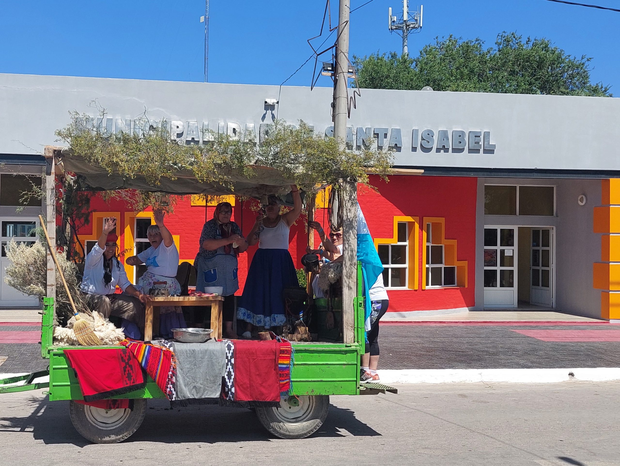 El desfile se inició con la bendición a los chivos – que son motor y sostén de economía en la zona- y luego de la autorización de rigor comenzaron a hacer su paso instituciones, carrozas alusivas, la planta automotor de Santa Isabel, el mercado artesanal con Andrea Pombar, directora del Producciones Artesanales, portando la bandera tejida y las agrupaciones gauchas de los pueblos vecinos, tropillas y hermosos emprendados. «Sin dudas trabajamos mucho para recibirlos con la cordialidad de nuestra gente. Queremos seguir recibiendo a los pampeanos y los invitamos a visitar los stands con exposiciones de diversas actividades como artesanos, servicios y otras actividades del pueblo», agregó el jefe comunal.