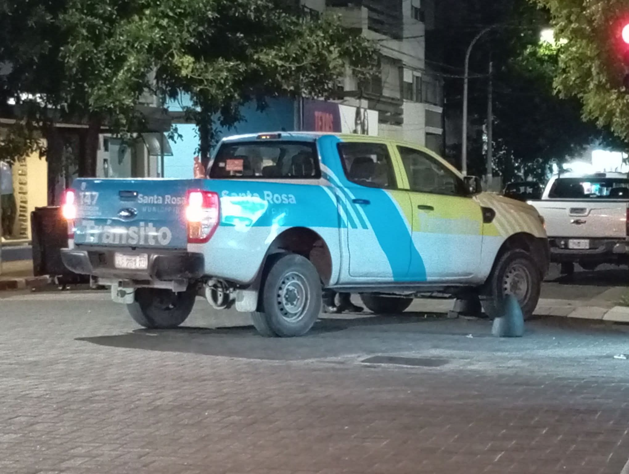Una camioneta Ford Ranger perteneciente a la Dirección de Tránsito de la Municipalidad de Santa Rosa chocó un bolardo del microcentro en la esquina de H. Irigoyen y 25 de Mayo de Santa Rosa.