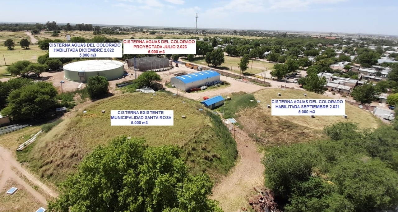 Aguas del Colorado terminó la segunda de las tres cisternas que almacenarán agua potable y que estaban previstas para incrementar las reservas de Santa Rosa. De esta forma se busca morigerar los efectos que podrían producirse ante eventuales cortes del Acueducto del Rio Colorado motivados por tareas de mantenimiento o roturas.