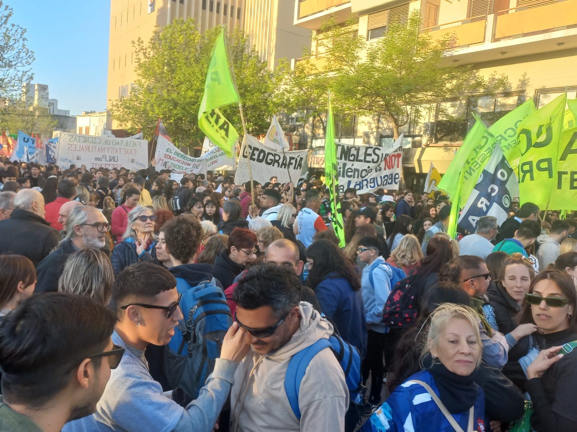Estudiantes, docentes y gremios se movilizaron en el centro de Santa Rosa donde reclamaron por el presupuesto universitario y contra el posible veto del Presidente Javier Milei a la ley de financiamiento universitario.