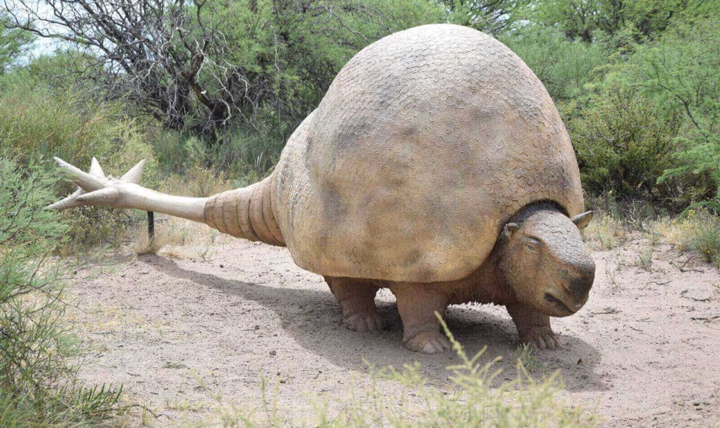 Se trata de cinco esculturas de tamaño natural de diferentes representantes de la megafauna de la región pampeana. Argentavis magnificens fue el ave de mayor tamaño de la historia del planeta, alcanzando los ocho metros de envergadura alar. Sus restos fueron encontrados en sedimentos del margen de las Salinas Grandes, cerca de la localidad de Macachín. Cardiatherium orientalis fue un roedor de gran tamaño, emparentado a los actuales carpinchos. De este roedor se hallaron restos en los alrededores de lagunas Chillhué y Guatraché. Un ejemplar del gliptodonte Doedicurus clavicaudatus, uno de los de mayor tamaño. Se caracterizaba por tener una convexidad en la parte anterior del caparazón y por el mayor tubo caudal (cola) de todos los gliptodontes, rematado en púas que usaba como defensa. Otro de los ejemplares es Smilodon populator, un felino de gran tamaño semejante a los leones actuales. Se lo conoce popularmente como “tigre dientes de sable” por presentar colmillos superiores que superaban los 15 centímetros de largo. Restos de Doedicurus y Smilodon fueron hallados en la ciudad de Santa Rosa en diferentes contextos de obras urbanas. Por último, Macrauchenia patachonica fue uno de los ungulados nativos sudamericanos de mayor tamaño, semejante a los actuales camellos. De dieta herbívora, se caracteriza por presentar los orificios nasales en ubicación superior en el cráneo, lo que supone la presencia de una pequeña trompa, semejante a los tapires actuales.
