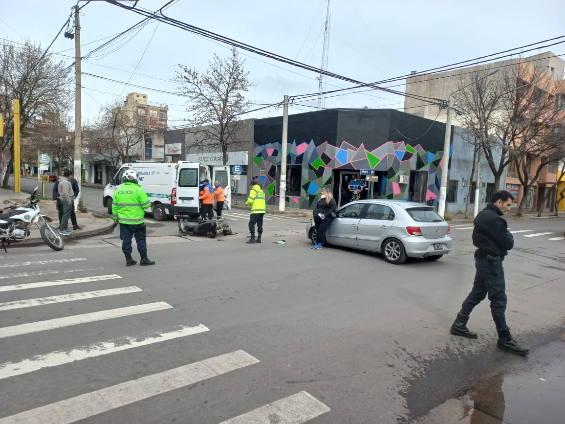 Impactaron un WV Gol color gris y una moto Motomel. Al automóvil lo conducía una mujer quien no sufrió golpes y circulaba por Pellegrini; y la moto conducida por un hombre circulaba por Sarmiento. Su conductor sufrió un fuerte golpe en su pierna izquierda y fue asistido en el lugar del accidente por personal del Servicio de Emergencias Médicas.