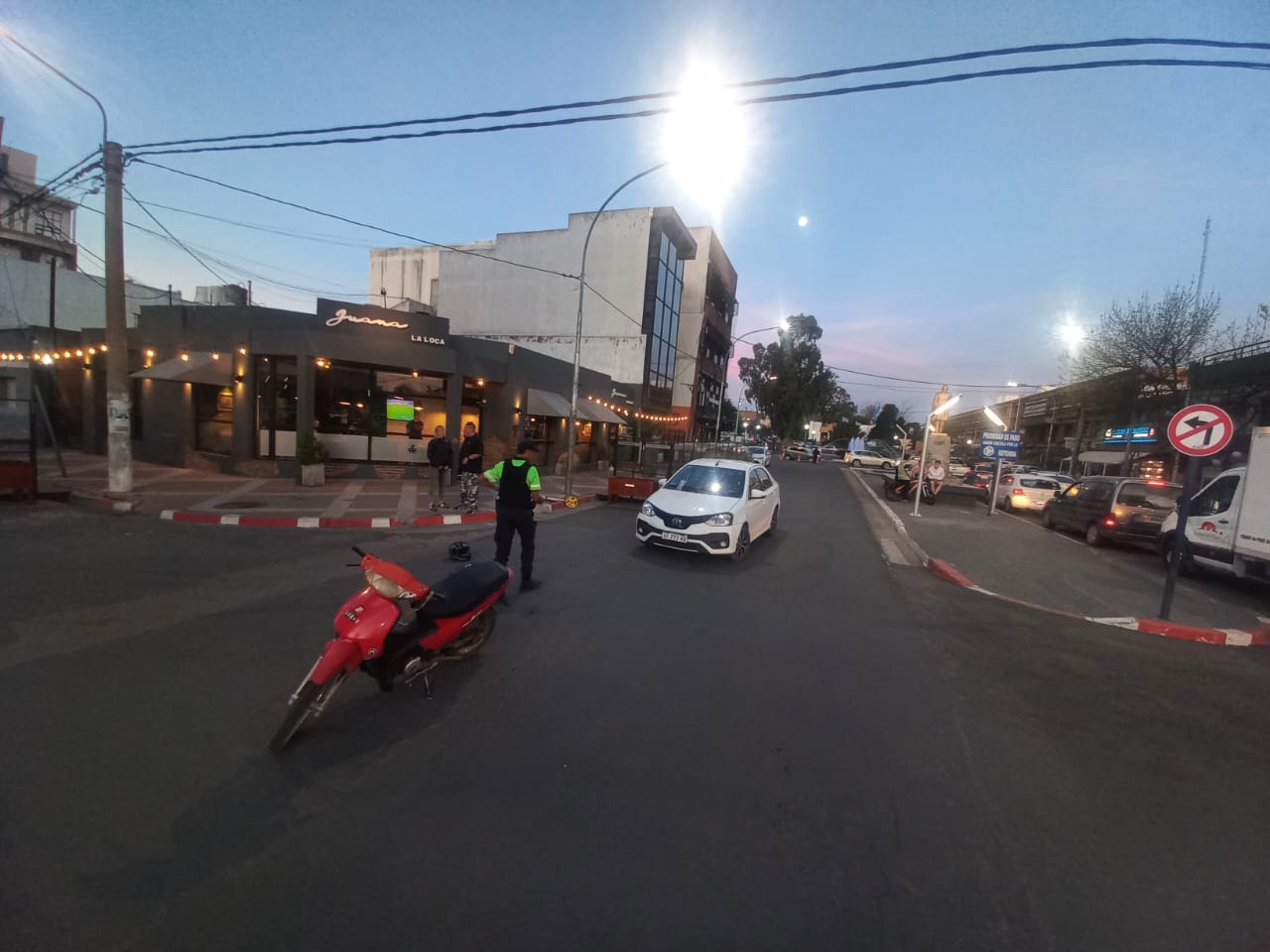 Por Avenida San Martin en el mismo sentido circulaba una moto Motomel 110 cc y detrás de la moto un Toyota Etios color blanco.Ambos circulaban de este a oeste al llegar por San Martin a Urquiza la moto freno de manera abrupta y el Toyota que venía detrás impactó la parte trasera de la moto.