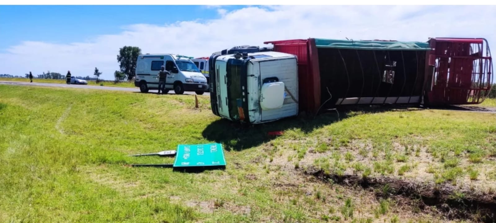 Sucedió hoy a las 11,30 horas en la ruta nacional 35 a la altura de Embajador Martini. Volcó un camión Fiat Iveco EuroCargo, iba cargado con hacienda y quedó cruzado en plena ruta.